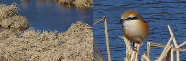 (左)画素数の多いデジカメであれば、撮影したときは野鳥が米豆粒ぐらいの大きさでも、(右)パソコンの画面で拡大表示すればどんな野鳥なのかが判別可能。拡大するとモズ、しかも雄であることが判明。