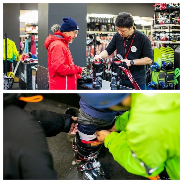 自分のサイズにあうスキー、ストック、ブーツをレンタル。ブーツをはくのにも一苦労。
