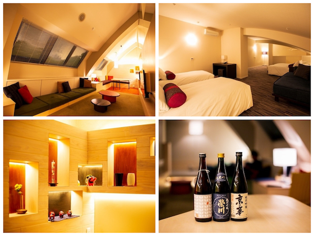 今回泊まった部屋は「会津モダンスイート」。リビングとベッドルームが分かれているメゾネットタイプの、ゆったりとした空間の部屋だ。部屋には日本酒セラーが置かれていて、栄川、辰泉、国権と、会津を代表する3つの酒蔵の純米酒がセラーの中に用意されていた。このお酒も宿泊料金の中に含まれている。ベッドルームには4台のベッドが配置されているので、ファミリーや友人たちとのグループにも最適だろう。