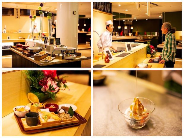 旅の楽しみは、なんといっても食事(お酒も含む)だ。その地方ならではの味に会えるのがなんとも楽しい。磐梯山温泉ホテルの夕食はビュッフェタイプ。ビュッフェといってもあなどるなかれ、目にも美味しい料理の数々が並んでいる。なかでも「ライブキッチンコーナー」は、目の前で、牛の鉄板焼きを焼いてくれ、蕎麦をうってくれ、天ぷらを揚げてくれる。部屋で食べるよりも、できたて、うちたてを味わえることができるし、料理人の方と食材のことや会津の郷土料理のことについて、いろいろと話を聞けることも、食事をさらにおいしくいただける大きな要因になる。そして、クラフトビールからデザートまで、大満足の夕食だ。