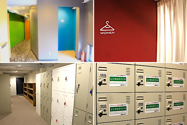(左上)靴箱の目の前にあるのが男子更衣室。(右上)奥に進むと女子更衣室がある。カーテンがかかっていて、中が見えにくくなっている。(左下)男子更衣室の中はこんな感じ。大小二種類のロッカーは鍵付きで安心。(右下)男子と女子の更衣室の間には有料の長期間用レンタルスペースがある。シューズなどいつも使うものを預けておくと、荷物が減って楽チン。