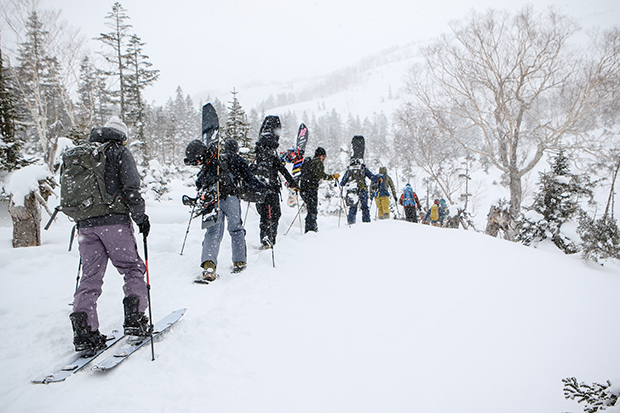 参加者はスノーボード+スノーシュー、スプリットボード、山スキーの混成。栂池高原スキー場のトップから、バックカントリーエリアに向かって歩く。前週の雨がありコンディションの心配はあったが、ガイドチームが安全なコースをセレクトしてくれた。新雪は場所によって約20cmから30cmぐらい。雪質も悪くなさそうだ。