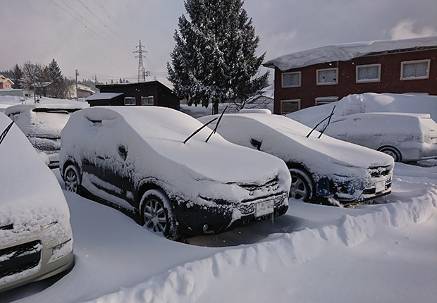 たっぷり睡眠をとった翌朝、会場に向かおうとホテルの駐車場に行くと、クルマには20cm以上の積雪。テンションも高まる。