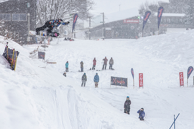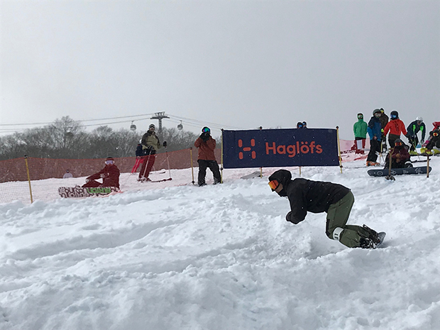 この日のエントリー数は約80名。使用する道具も千差万別。スノーボードは、フリースタイル系からマウンテン系、それにスプリットボードの人もいる。スキーにはアルペン系やテレマークまで。参加年齢はキッズから五十代(私)までと、幅広い。レベルとしては総じて高いが、転倒しながらもチャレンジしている人もいる。この自由な感じもまた楽しい。