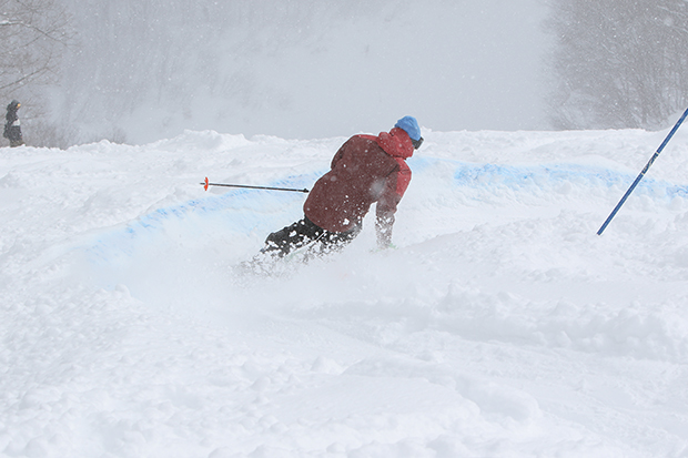 日曜日。この日はバンクドナチュラルフリーライディングの大会が開催される。地元小谷村在住のプロスノーボーダーでありホグロフスフレンズの渋谷謙がプロデュースした特設コースが会場となる。取材だけのつもりが、ぜひとも体験すべしとの声に押されてエントリーすることになった。エントリーした中でおそらく最年長。老体にムチ打って、コースインスペクションに挑んだ。