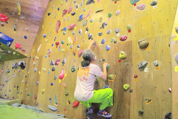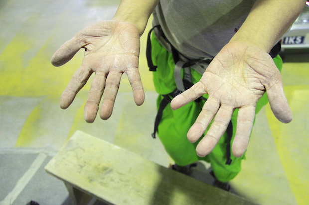 腕と指には、相当の負担がかかっていた。筋肉痛まではいかないものの、疲れの兆候が感じられる。登っていた姿を見てくれていたKさんが「常に腕が曲がっている状態ですから、基本腕は伸ばして。次のホールドに手を伸ばすときは、腕の力ではなく足で登るイメージで」とアドバイスしてくれた。腕を曲げたままでは、常に負荷がかかっている状態で、疲れも早くやってくるという。確かに登っている最中に腕と指はずっと緊張したままだった。