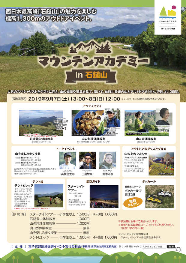 9月7日(土)~8日(日)、標高1,300mにある石鎚スキー場で開催される「マウンテンアカデミーin石鎚山」は、「山を学んで楽しむ」をテーマに登山教室やトークショー、山の料理体験などが行われるキャンプインのイベント。東予を貫く石鎚山脈が会場の背後に連なり、絶好の会場ロケーションも話題となっている。