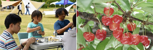 左/親子でアウトドアの道具を手作り。自分の手で作って、自分たちで工夫しながら遊ぼう、というイベントです。 右/山形はさくらんぼの旬を迎えます。この真っ赤なみずみずしいさくらんぼを、産地で思い切り楽しむチャンスでもあります。