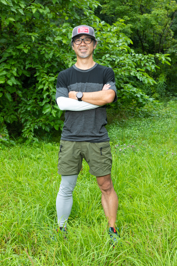 短パン好きな筆者も虫除けせずに藪に入っていくのは勇気がいる。笑顔も引き攣り気味。
