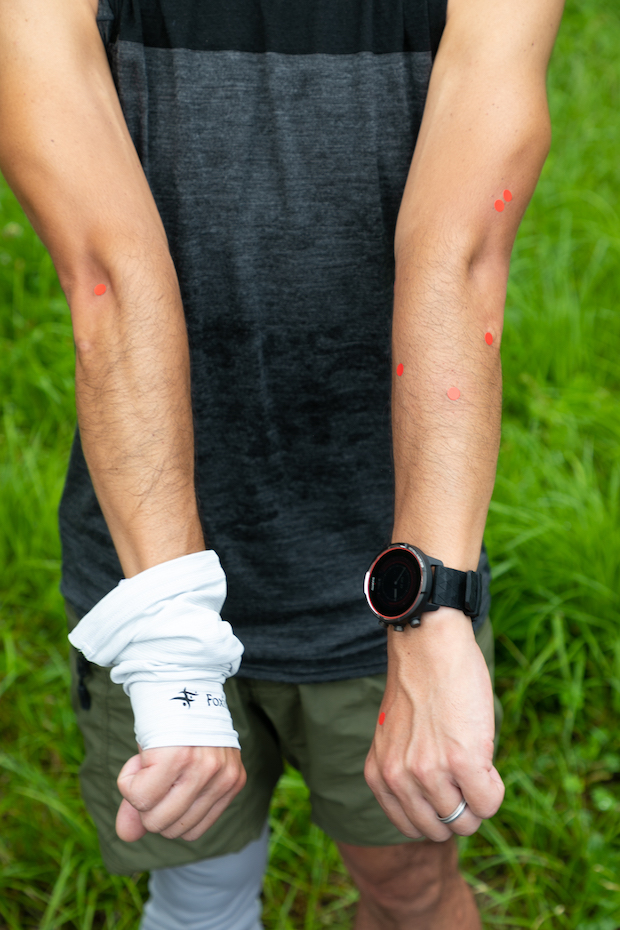 足の刺された数を数えようと思ったが、同じような場所を複数刺されているので、大きく腫れ上がってしまいよくわからない。というか数えるのが面倒なほど刺されている。しかし! スコーロンを着用していた方は明らかに少ない! 蚊は高さ1m付近までが狩場のようで腕の方はあまり刺されなかったが逆に数えやすいので撮影してみた。写真だと分かりづらいので刺された箇所に赤いシールを貼ってみた。生身の方は見えている範囲で7箇所、アームカバー着用側は1箇所と差が出た。
