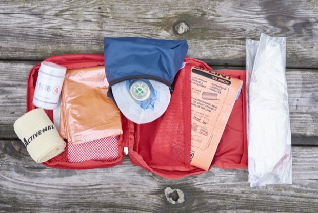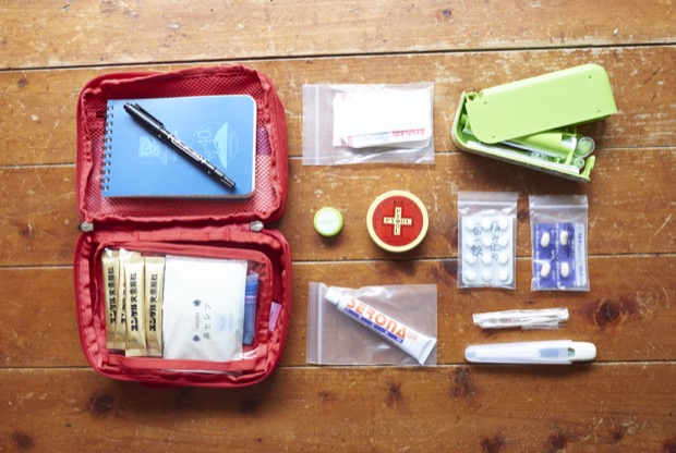 今回のような子どもを外で遊ばせるシチュエーションでは、もうひとつの僕のセットの方が参考になると思います。軽度のケガなどに対応する応急処置セットですね。ばんそうこうや、体温計、ポイズンリムーバー、塗り薬、状況を書き留めるメモ帳、常備薬(自分用)などですね。