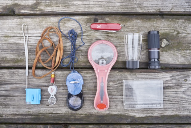 虫眼鏡や拡大鏡など、観察系が多いですね。右上の黒いのは単眼鏡なんですが、その左のプラスチックのものを装着すると拡大鏡にもなります。その下にあるのは虫や、水と一緒に小魚を入れるなどして生態を観察するケース。