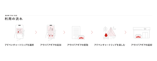 心ふるえるアドベンチャートリップの提案、それに必要な場所・アウトドア用品を一括で手配できる、株式会社RESONATUREが提供する「offto(オフトゥ)」だ。このwebサービスを使えば、アウトドア用品を持っていない都市生活者でも気軽にアウトドアを楽しむことができるようになる。