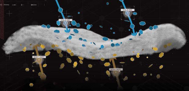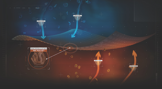 「パワーエアはシェッドロスに繋がるだけでなく、生地そのものもとてもユニークです。起毛していないので袖を通したときに滑りやすいし、ドレープが美しい。2方向のストレッチ性があってフィット感もいい。空気の層が体に近いのであたたかさを感じやすいし、フリースに比べると防風性も高い。ポーラテックで15年以上働いていますが、とてもおもしろい素材ができたと思っています」