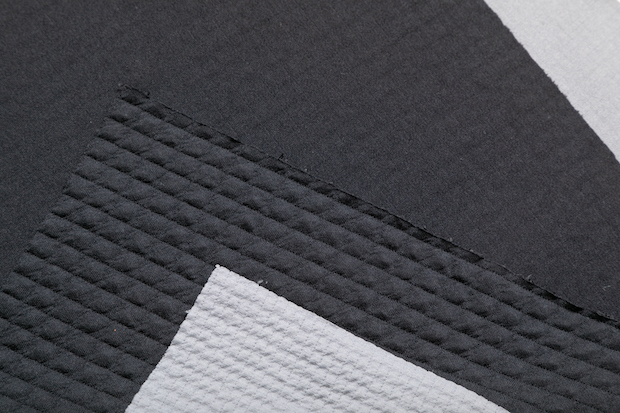 ウェアの製造時、スクリムはそのまま縫いこむか、剥がして捨てるかのどちらかになるが、残しておくと伸縮性を阻害するし、剥がして捨てると手間とゴミが出る。それに対してパワーフィルはキルティングの必要もないほどにしっかりしていて、洗濯しても簡単には偏ったりちぎれたりしないという。