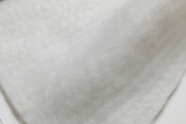 「化繊の中綿は、通常“スクリム”と呼ばれる不織布に挟まれています。短繊維でつくられる中綿は、このスクリムがないと形を保てないので持ち運びができません。しかし、私たちのパワーフィルは、このスクリムを必要としません」