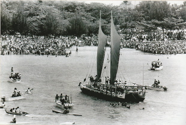 1987年、ハワイからアオテアロア(ニュージーランド)までを往復し、ハワイに帰還したホクレアを迎える人々。©️Honolulu Star-Advertiser