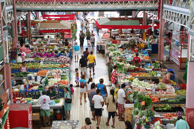 出発まで時間があったので、タクシーでパペーテの町に出て、腹ごしらえをと、まずはマルシェへ向かった。町の中心にある公設市場だ。市場は、タヒチの庶民の食文化や物価を知るのにいい。沿岸で獲れた魚とともに、色とりどりの野菜や果物が並ぶ。祖先の主食だったタロもあった。この南洋のサトイモは、稲に水稲と陸稲があるように、田でも畑でもつくられる。田芋の方が味は濃厚で、ポリネシアだけでなく、蘭嶼や沖縄にもつくられているが、タヒチでは畑芋が多い。