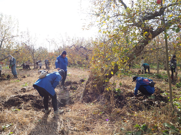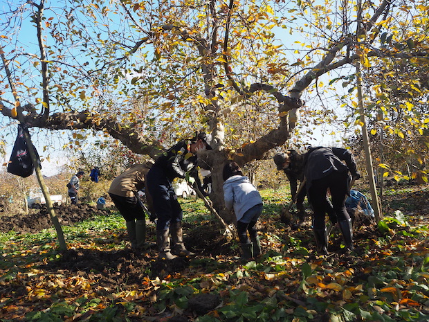 集合場所から泥出しする場所まで歩いていく。いったい何本のリンゴの木があるのだろう。ほとんどが手つかずのようだ。スコップを借りて作業をはじめる。草が生えはじめたところや泥がむき出しのままのところなど様々だ。流れてきたゴミが幹に漂着したままの木もある。スコップを入れることで、土の中の違いも直に感じられる。深いところで20センチ以上。泥は浅いところでも10センチくらいはあっただろうか。何度か参加しているボランティアの人の話によると、朝の最低気温が氷点下になったことで泥が固まり、泥出しの作業は前よりも楽に感じたという。これはあくまでも比較の問題であって、半径1メートルの泥出しは予想していた以上に重労働だった。4人で一本の木の泥出しをするのに10分程度かかる。なかには30分もかかってしまうほど苦慮する木もあった。難しい作業ではないので、やりながらより負担のかからない方法を模索していく。子どもたちは、泥遊びを楽しむように泥出しをしている。