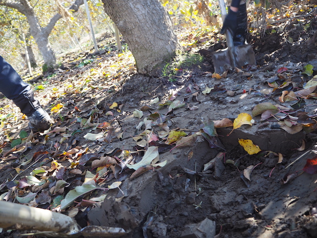 幹から半径1メートルほどの泥をかいていく。深く掘るとミミズもうじゃうじゃ。土が肥沃であることも教えてくれる。