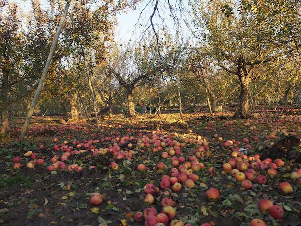 赤沼地区のリンゴ畑でも1.5メートルほどの冠水があったという。確かに枝にはまだ泥がついている。木の上の方についた実は、しっかり洗って皮を剥けば食べられないわけではない。けれど商品としての出荷はされていない。地面に落ちたリンゴの風景を見て、参加する僕らは「もったいない」と思ってしまったけれど、そのリンゴを作った農家さんにとっては無念以外の何ものでもないのかもしれない。