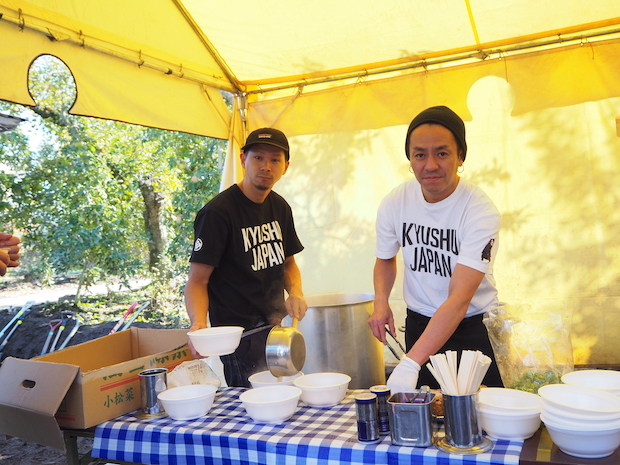 博多からスープや麺を持って長野まで来た秀ちゃんラーメンのふたり。人気博多ラーメンを野外でみんなで野外で味わう。