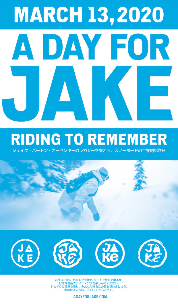 スノーボードカルチャーの先駆者であったジェイク氏の死を偲び、彼の功績をたたえるため、バートンは3月13日(金)にスノーボードの世界的記念日「A Day For Jake」を開催するという。