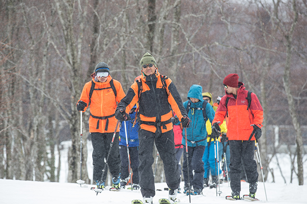 ガイド寺嶋さんの案内でブナの原生林へ。山のうえは悪天候でも、ブナ林のなかは風も当たらず穏やか。正直、履いたことのない板やブーツで山へ行くことに抵抗がありましたが、クセがなく扱いやすくてひと安心。