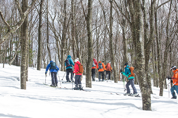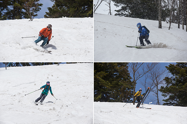 適度な間隔のブナ林を抜け、広い斜面を滑って宿へ戻る。(左上)アメアスポーツジャパンの副社長自身もフィールドへ出かけアウトドアを楽しんでいます。(右上)大学時代はライフセービング部に所属していた体育会系女子、サロモン広報の中村さん。(左下)前につんのめらないよう必死に耐えながら滑る。(右下)スント広報の関根さん。毎週あちこちの山に登って滑るバリバリの山スキーヤー