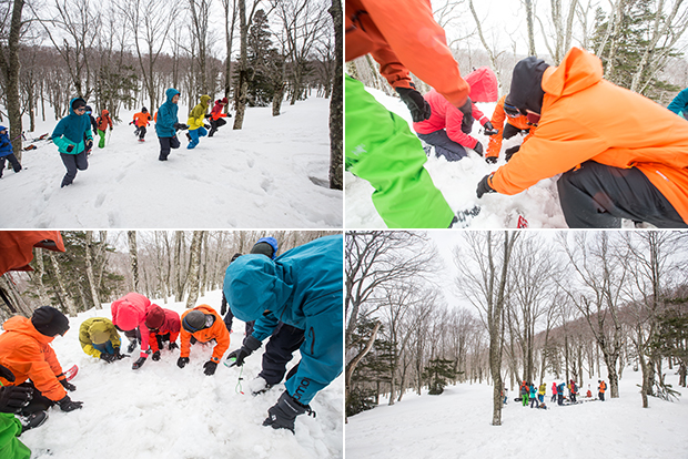 開けた場所でビーコントレーニング。雪に埋められたビーコンを探します。チーム対抗で景品付き…みんな本気です