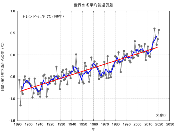 世界の冬(前年12〜2月)平均気温偏差の経年変化(1892〜2020年:速報値)