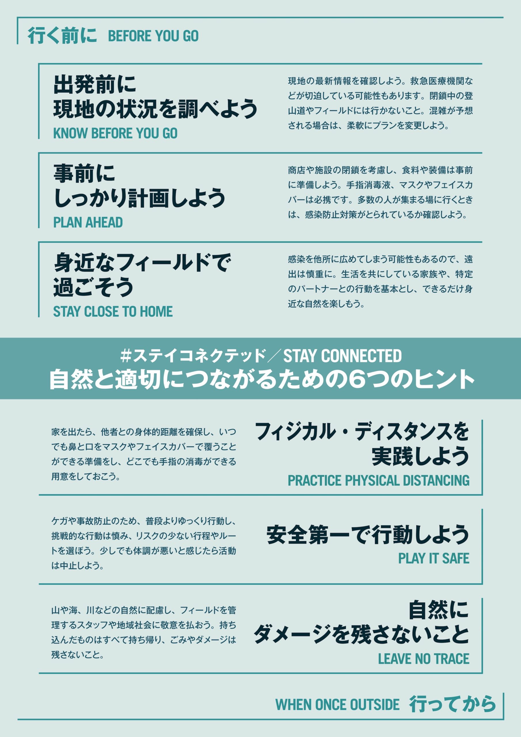 誰もが野外活動を楽しむことができるよう、家族や周りの人々、フィールドを提供してくれる多様なコミュニティ、そして、多様性に満ちた豊かな自然のいずれとも “適切な社会的距離を保ちながら、つながり続けることで、相互にその恩恵を平等に享受すること”ができるはずです。