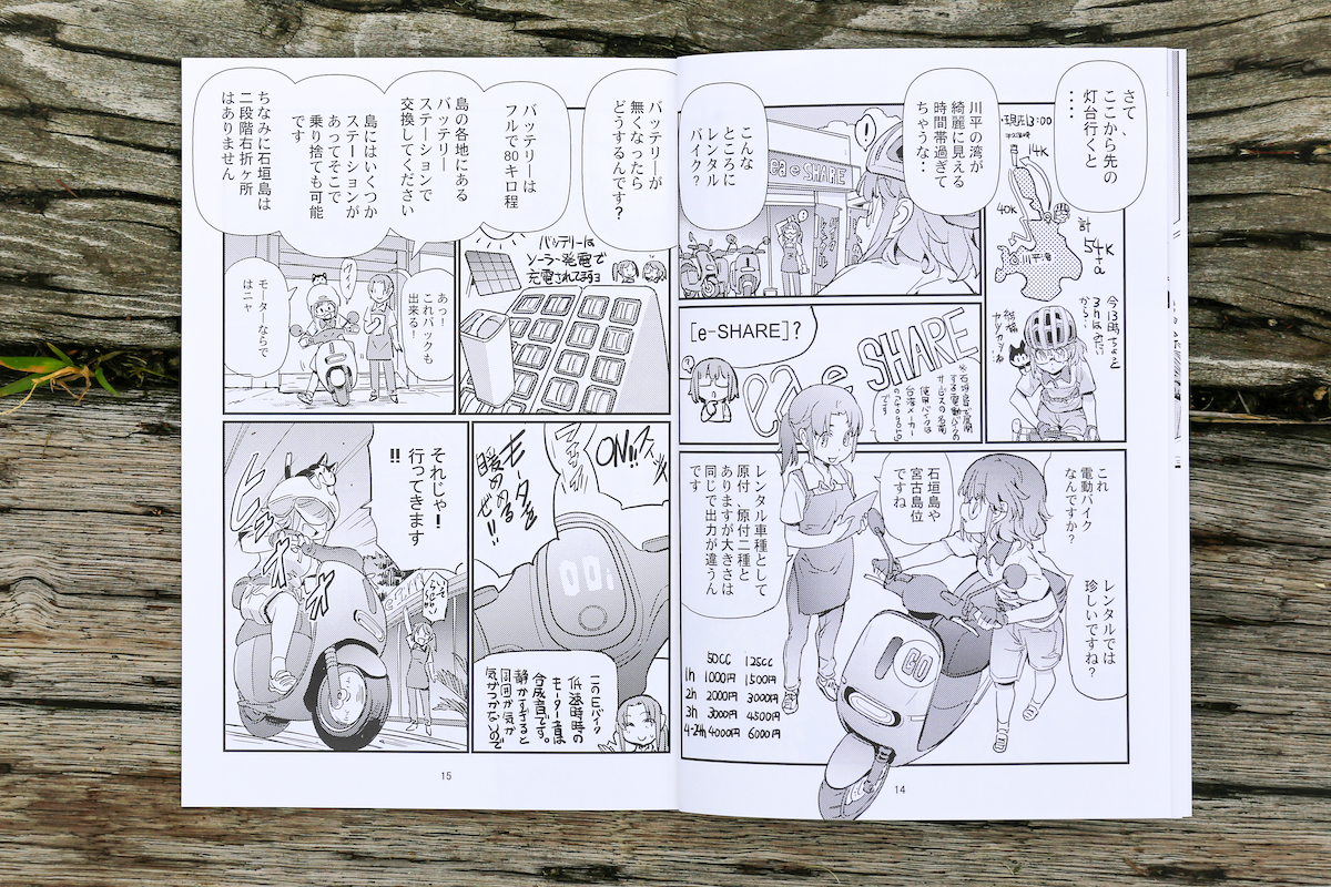 ストーリーとしては、松本先生(女性の設定)が受けていた仕事をクライアントに延期され、時間ができたので沖縄の島を巡るというもの。輪行バッグで自転車を運び、サイクリングをしながら島を観光。電動バイクやクルマも借りたりして、絶景スポットを観て、おいしい食べ物を食べます。