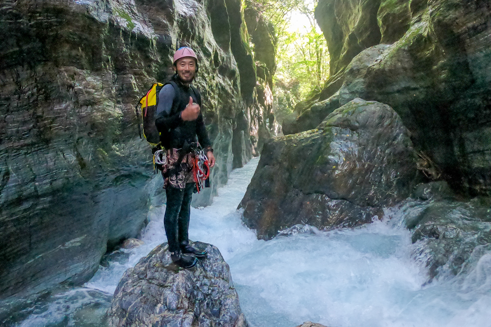 なかでも地元で話題なのが、高知県仁淀川町の中津渓谷。遊歩道のある観光地にもかかわらず、ここにほぼ人跡未踏だった峡谷区間が。それを開拓したのがリバーガイド(ラフティング、カヤック、キャニオニングなどのガイドの総称)の神澤識大(かんざわ のりひろ)さん。まずはその峡谷の様子をご覧ください。