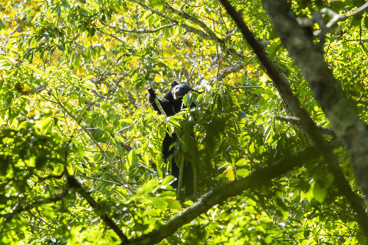 クマだ! ミズナラの上の方で黙々とドングリを食べている。