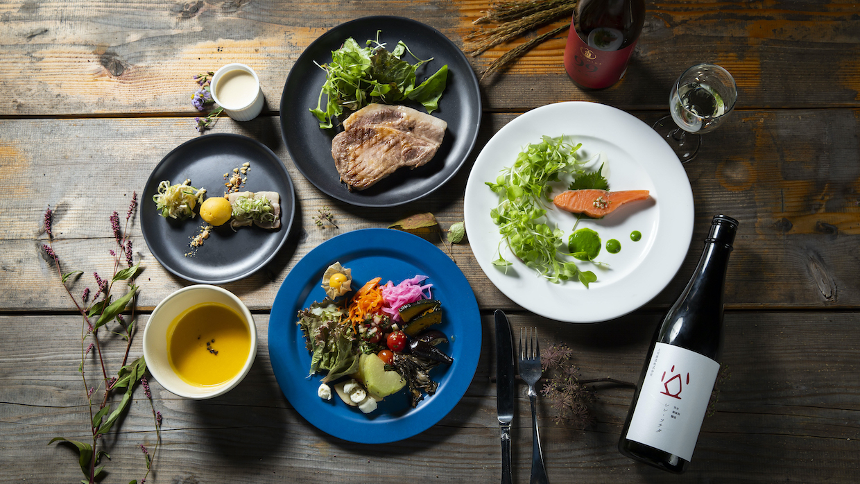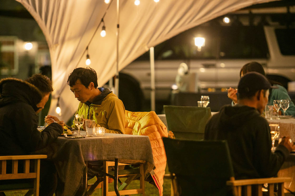 あたりが暗くなってくると、待望のグランピング形式のディナーがはじまった。ナイフにフォーク、ワイングラスとかなり本格的にセッティングされている。一品目はオードブル、そしてスープに魚、肉料理とコース料理が次々をサーブされる。地産地消とテーマとし、この地域で取れる食材を使用しているという。いっしょに出された日本酒も地元のものであった。