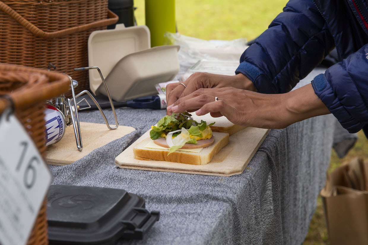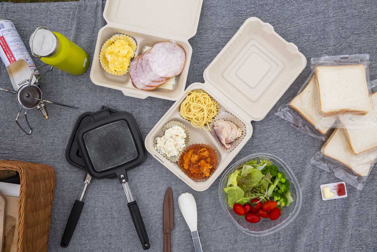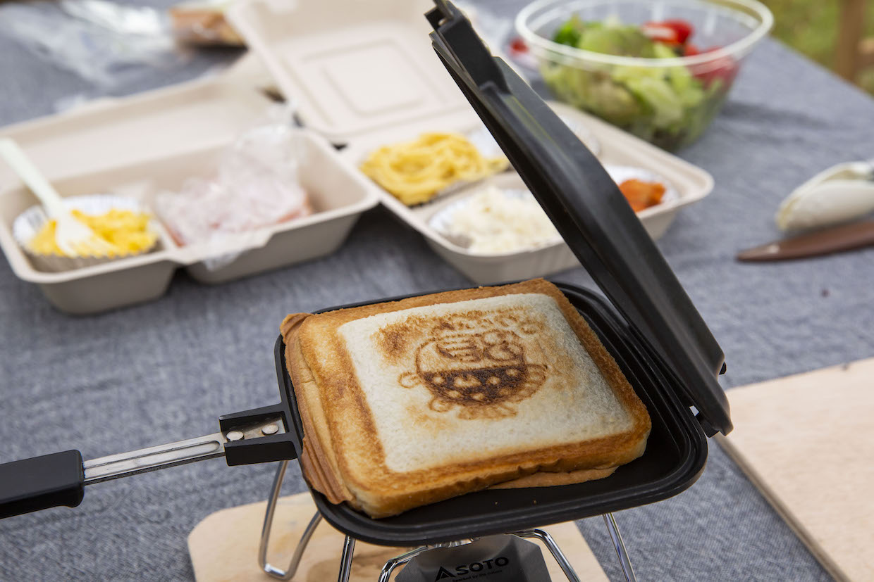 テント内のテーブルには大きなバスケットが用意されていた。中を見るとホットサンドメーカーが。ハムやチーズ、卵といった定番の具材から、鶏肉やポテトサラダなども入っている。