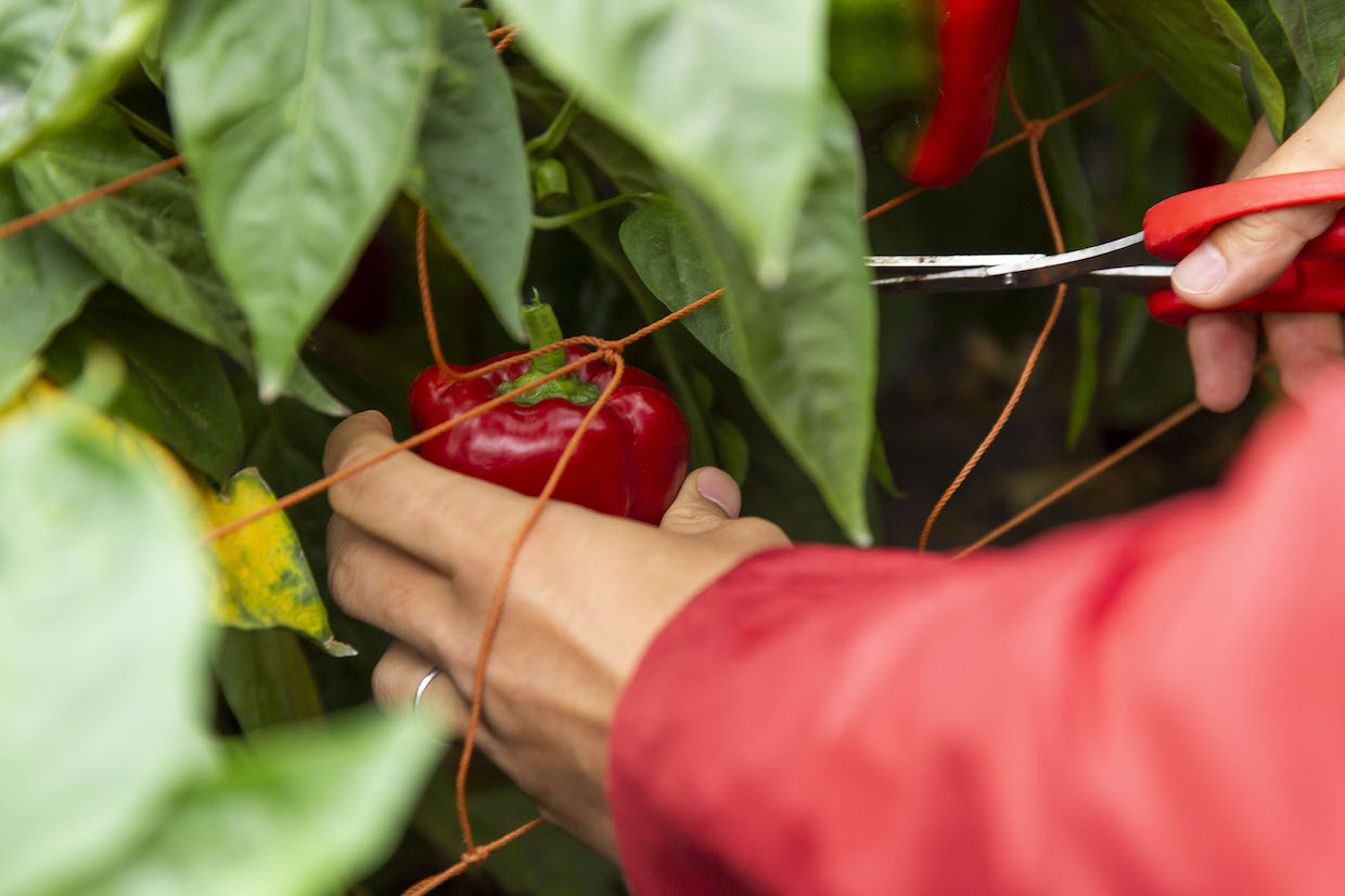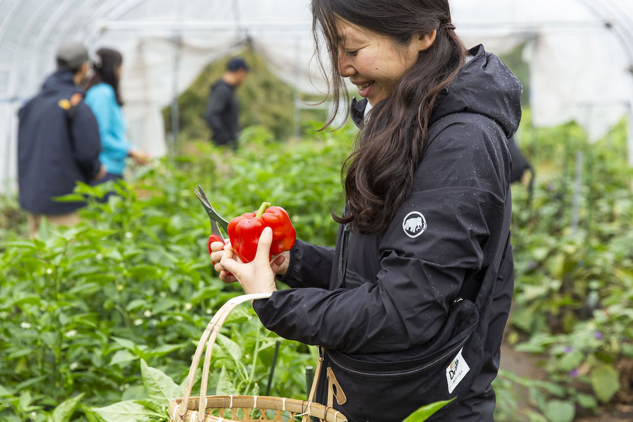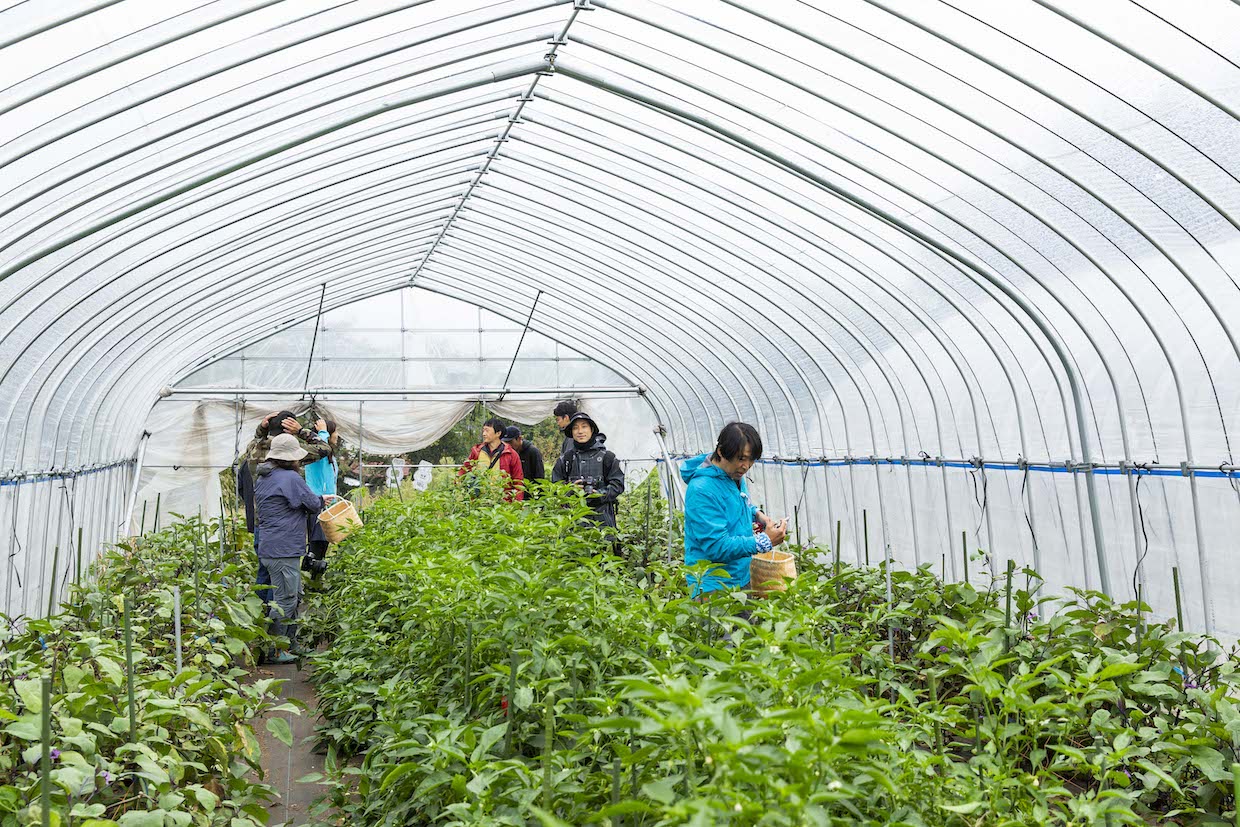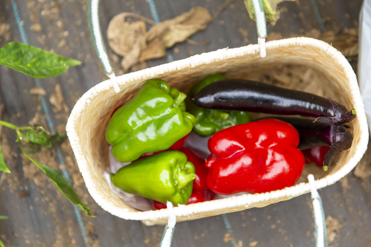 ロッジなどがあるメインスペースから道を下っていくと収穫体験ができる「ミッフィー農園」がある。各自、カゴとハサミを持ったら収穫開始! ナスにトマト、パプリカにニンジンがなっている。ビニールハウスだから夏野菜も取りごろだ。