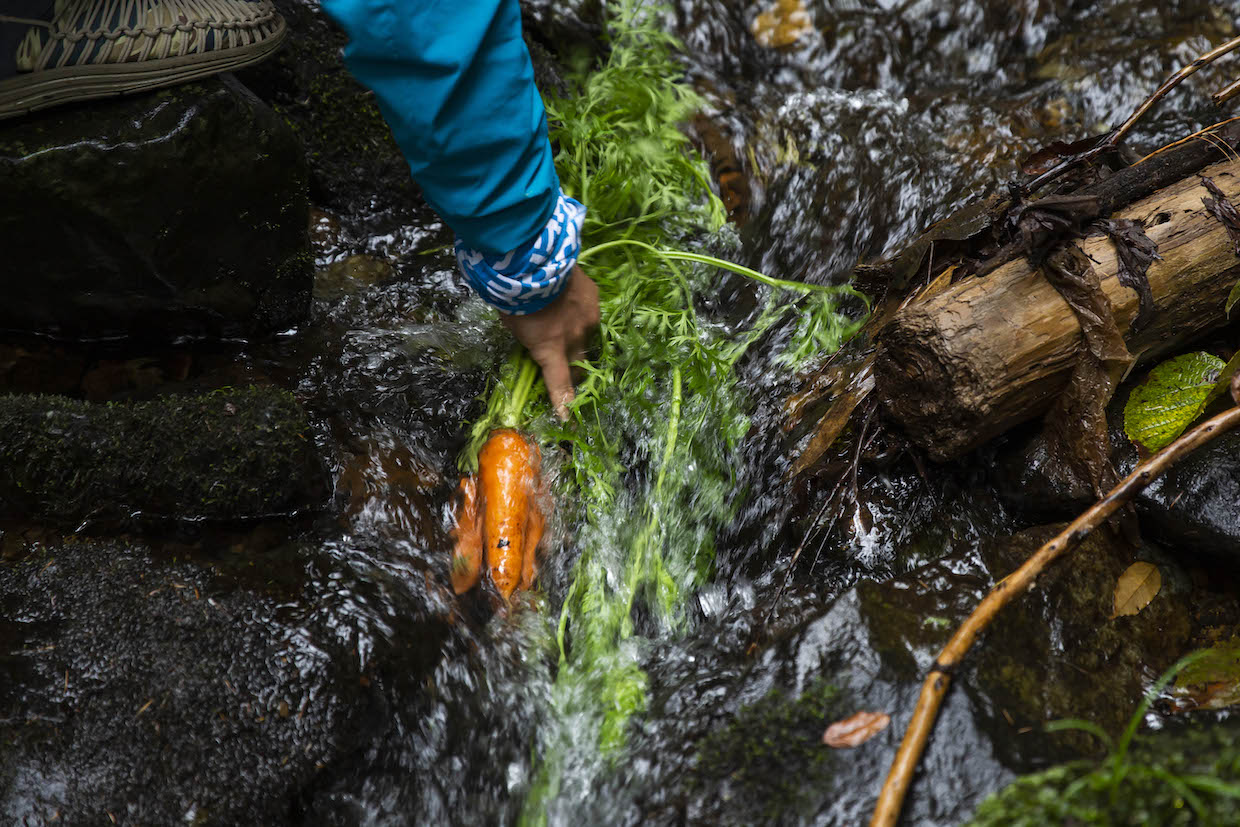収穫が終わったら、お腹を空かせるために沢へ移動した。沢沿いには遊歩道が設置されていて、自然を堪能しながら散策できるようになっている。各々、収穫した人参を洗ったり、自然観察を楽しんでいた。