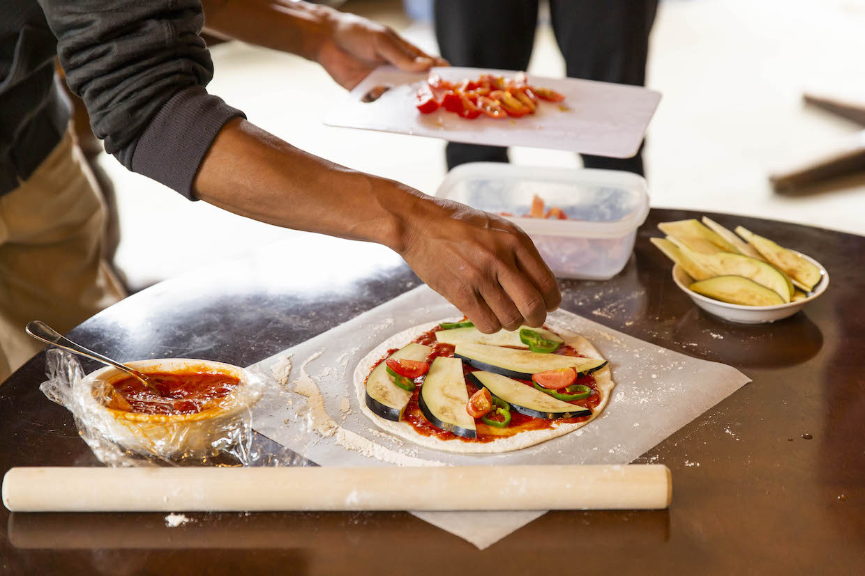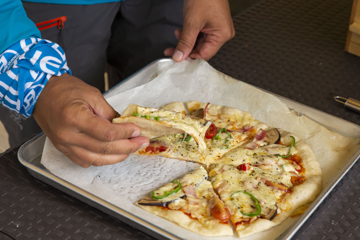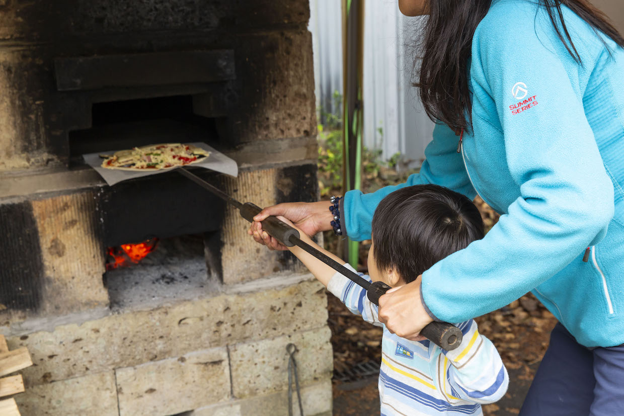 お腹が空いてきたら昼食づくりに取りかかる。収穫してきた野菜を切って、生地を丸く伸ばし、盛り付けて石窯に入れると……、ピザのできあがり!! 収穫直後の取れたて野菜を、すぐにピザにして食べるって、なんて贅沢なのだろうか。