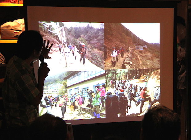 いつもの賑わいを見せるエベレスト街道の様子を説明する近藤さん。これは、地震前の様子で、たくさんの登山家たちが行き交う様子が映し出されていた