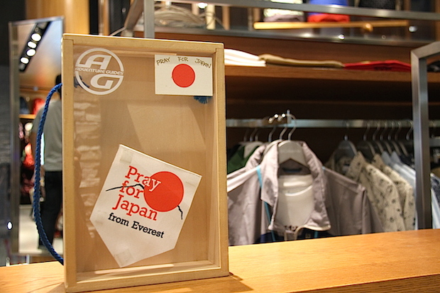 コロンビア原宿店の報告会の会場に設置された募金箱。近藤さんたちが、3.11のときに現地で募金活動を続けて来たときの箱そのものである。今回は近藤さんの著作の販売もあり、その売上げの一部はしゃくなげの花プロジェクトへ寄付されることになっている