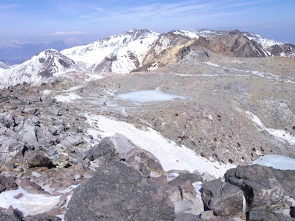山頂までの前半の道のりでは、蒸気を上げる噴気孔がいくつもあります。たしかに箱根の大涌谷か、那須岳の登山道沿いにでもあるかのようなルートです。それと、季節が冬だけに花は少ないのですが、それでも名残はいくつもあるようです。ちっちゃなスミレがかわいかった。もうちょっと先の、花の季節にも期待できそうですよ。