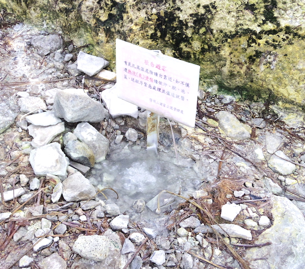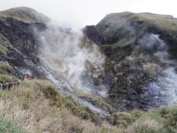 この小油坑は観光地のひとつにもなっているらしく、平日の水曜日だというのに、地元の人たちで賑わっています。それもそのはず、バス停の近くには、モクモクと噴煙を上げる爆裂火口が大きな口をあけていました。しかも、かなり近くまで遊歩道がつけられており、噴火口を覗き込むこともできるほど。御嶽山のことが頭を過ぎり、少し怖くなってしまうくらいでした。