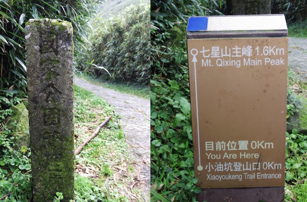 小油坑の登山口に設置されている道標。左の古い石碑には「国家公園管理」の文字。右の道標は、歩行距離を表示している陽明山エリアに共通したモノ。日本の方式とちがって、距離が短くなっていくのではなく、自分の居る位置を示す方式になっています
