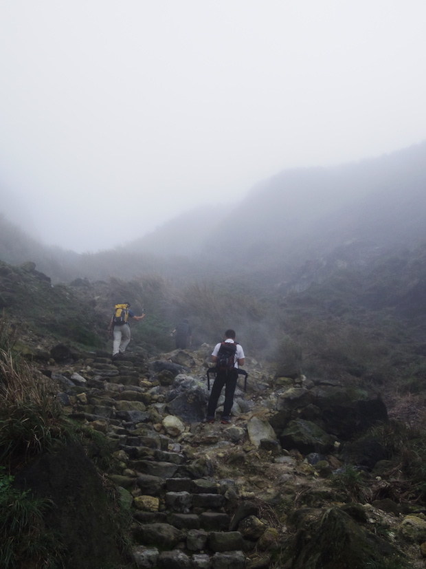 登山道は、この小油坑の噴火口の縁を回っていくかたちで上へ上へと延びています。さすがに国家公園だけに、道はかなり手入れが行き届いています。足元はいい具合に、整備された石畳か石積みの階段となっています。山頂までは1.6kmほどの距離しかないので、のんびりと景色を楽しみながら登っていきます……と、思っていたのですが、標高を上げるにしたがって白いベールが密度を上げていくばかり。ポイントポイントに展望台も設けられているので、本当は眺めも相当なもののはず。案内版には「眺望 大屯山火山群峰」なんて文字とともに、うつくしい山並みの写真が載せられていたりするのですが。残念。