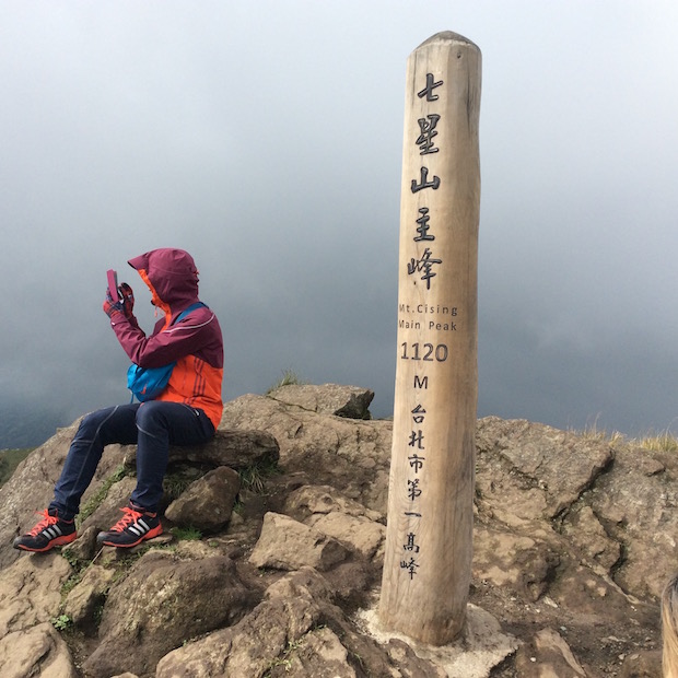 山頂には「七星山主峰 Mt. Cising Main Peak 1120M 台北市第一高峰」と彫られた立派な道標が立っていました。そのすぐ近くには、台湾式の三角点が設置されています。ちゃんとタッチしておきましたよ。登頂完了! それにしても、山頂は地元の人たちで大にぎわい。台湾の山ガールたちも元気に登っていましたね。