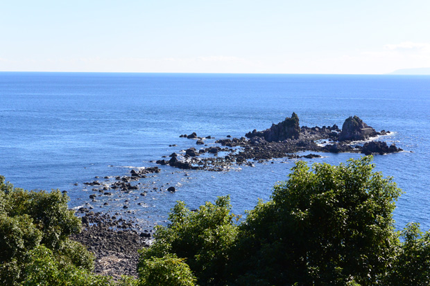 真鶴半島には、御林といわれる魚付き林があり、昔から伐採を禁じられてきたため、いまでも目を見張るようなクスノキやマツ、シイといった巨木が生い茂る。この貴重な森を巡る遊歩道と陽光きらめく海岸線を結んだひだまりハイキングがなんといってもおすすめ。写真は真鶴半島先端にある三石。