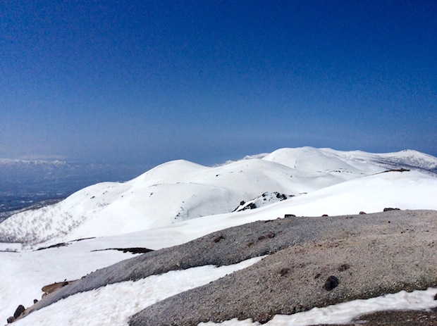2峰目イワオヌプリから進行方向を眺めて。真っ青な空にクッキリと雪山の稜線が浮かび上がり、今から歩く道を前に気合いが入る