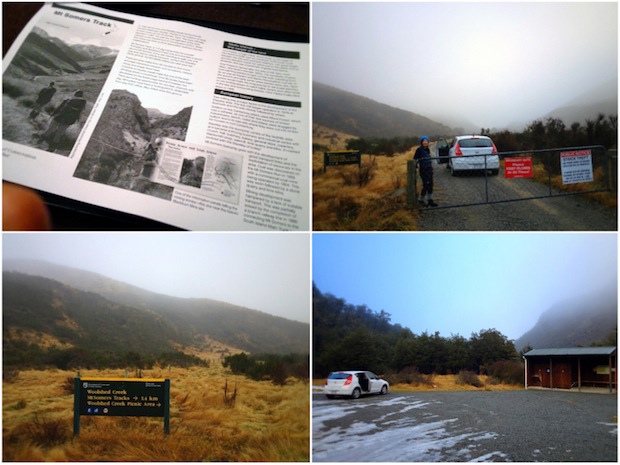 あまり良いとは言いがたい天気が気になりますが、Mt Somers Tracksと書かれた標識を目にし、登る前からすでに“やってやったぜ感”満載の自分たち。駐車場にはトイレも完備されていました。が、ほかのクルマが一台もない……。不人気エリアなのか、一抹の不安がよぎります。
